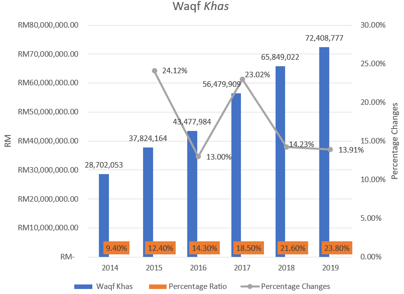 Figure 2 shows the waqf khas managed by PWS from 2014 to 2019. Every year, the value of waqf khas collected by PWS rises dramatically. The largest collection value was gathered in 2019 (RM72,408,777) with a ratio of 23.8 percent compared to the previous year (65,849,022) with a ratio of 21.6 percent. While the lowest collection throughout the six-year period occurred in 2014 (RM28,702,053), with a ratio of 9.4 percent. Overall, the waqf khas increased year after year, with no decreases over the six-year period. This demonstrates that the general public is aware of the significance and necessity of waqf khas for the wellbeing of Muslims. For the six-year period from 2014 to 2019, the overall average for waqf khas was RM50,790,318.