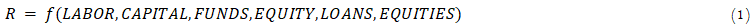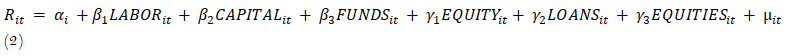 R is the dependent variable measured by the ratio of total revenues from interest to total assets (i.e., return on assets, ROA) or to equities (i.e., return on equities, ROE). The independent variables are as follows: LABOR represents the cost of labor measured by the ratio of personnel (managerial) expense to total assets. CAPITAL is the cost of fixed capital measured by the ratio of other operating and administrative expenses to total assets, and FUNDS is the price of deposits measured by the ratio of interest expense to total deposits. Other variables were included to control for banking factors. LOANS was measured by the ratio of net loans to total assets. DEPOSITS is the ratio of total deposits to total assets, and EQUITY represents equity capital measured by the ratio of equity to total assets.