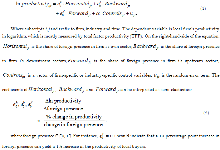 A majority of previous studies investigates the FDI spillover effects by estimating the so-called FDI spillover regression equation, which regresses the linkages of local firms with foreign firms on their productivity: