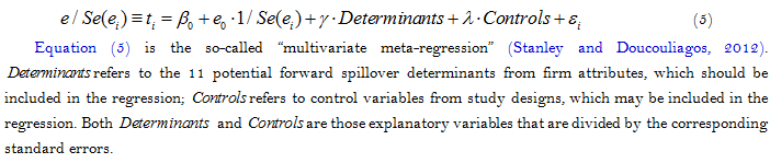 There are merely several studies on FDI spillovers using MRA method. Gorg and Strobl (2001) investigate the influences of study design and publication bias on the results by collecting information from a sample of published and unpublished papers. They find evidence of publication bias and that study design may affect the results. Wooster and Diebel (2010) use a sample of 32 studies to determine the effects of study design and data characteristics on the magnitude, significance and direction of spillovers from FDI in developing countries. Mebratie and van Bergeijk (2013) examine the relationship between different firm heterogeneity characteristics and productivity, and argue that exports and R&D are two important sources of results heterogeneity, and find positive and significant effects of labor quality, size and export. Hanousek et al. (2011) find that panel studies are likely to find relatively lower spillover effects; the choice of research design, such as definition of firm performance and foreign firm presence matters. The above literature examine the source of heterogeneity of estimated spillover effects. However, the determinants of FDI forward spillovers are still unclear.