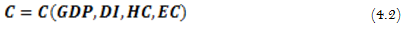 C depicts corruption as a function of the independent factor (Y). Based on the literature, the elements of vector Y are grouped into four major variables: economic growth (GDP), human capital (HC), domestic investment (DI), and the entrepreneurial ecosystem (EC); hence, Equation 4.2:
