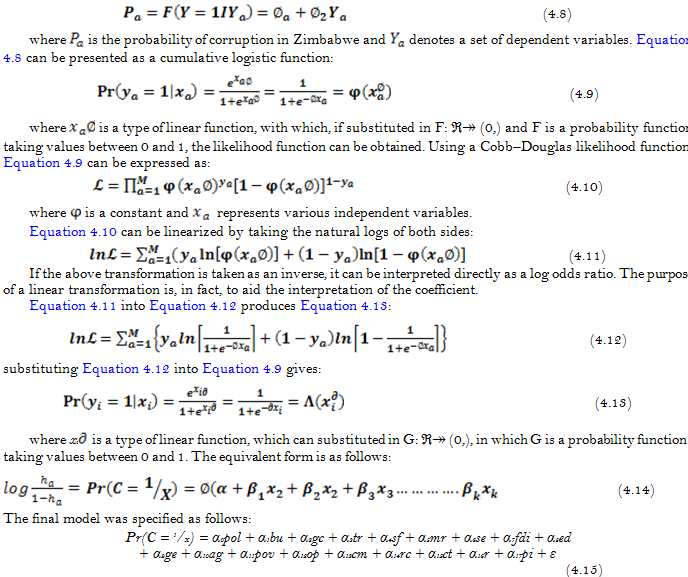 This study departs from the decomposition methodologies and ordinary least squares (OLS) models popularized by many researchers investigating the causes, consequences, and dissemination channels of corruption in some developing countries (see Mauro, 1995); instead, binary choice models are employed. The model for corruption can be expressed initially as a functional equation (Equation 4.1 ):