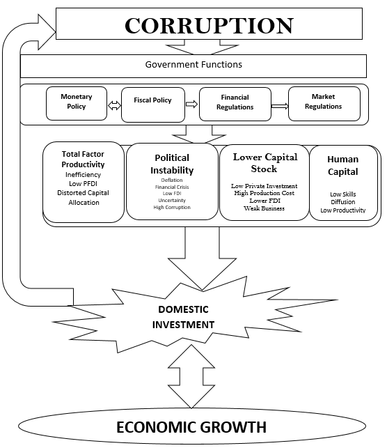 Above all, fiscal authorities often allow public officials full discretion in applying financial and market rules and regulations without any effective supervision, facilitates the spread of corruption throughout all sectors of the economy. The ultimate consequence of corruption has been reflected in reduced total factor productivity and human capital productivity, sociopolitical instability, less required capital stock, low domestic investment, and less economic growth. As economic agents struggle to circumvent the financial and market regulations imposed, they are forced to pay bribes/inducements. In turn, public officials impose more regulations to increase the lucrative opportunities for future rent-seeking activities. This vicious cycle endlessly persists: corruption causing less economic growth and lower economic growth causing more corruption—the dissemination channels thus exert a bicausal effect.