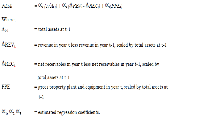 The most popular discretionary model to measure income smoothing is by using Jones (1991) model. Jones model could decompose accruals into two groups namely, discretionary and non-discretionary accruals. The advantage of Jones model is that it is simple and easy to implement. Jones (1991) proposed a model assumption that nondiscretionary is constant. Modified Jones model proposed by Dechow et al. (1995) consider the change in sales are attuned for the variation in receivables. The Modified Jones model is planned to reduce the measurement inaccuracy of discretionary accruals especially in a situation where discretion is applied over revenue. This study defines accruals as net income less cash from operation as we will identify the non-cash income. Jones (1991) is as follows: