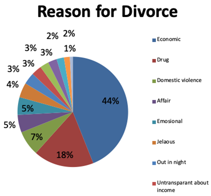 According to respondents, divorce occurs due to several factors, including economic factors, narcotics, and so on. More details can be seen in the Figure 3. Figure 3 shows that economic factors are the highest reason (44%), followed by narcotics or alcoholism (18%) amongst 232 couples during 2019. Divorce due to domestic violence was 7% or as many as 17 people from 232 couples, and both cheating and emotional reasons were 5% or 15 couples each. Next 4% of divorces occurred because of jealousy and 3% each because of being out at night, not being transparent in financial management, never making love, the husband remarrying and arranged marriage. Finally, there are four couples or 2% who claim divorce occurred due to gambling, and two couples or 1% due to mental disorders.