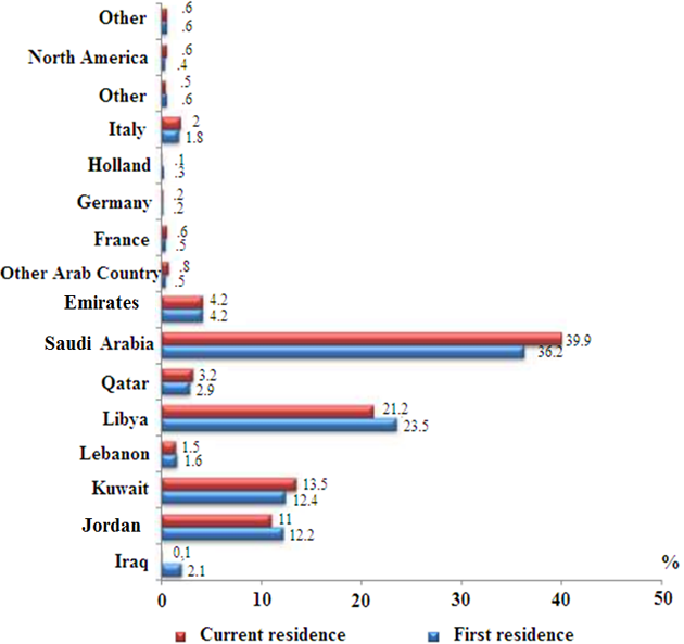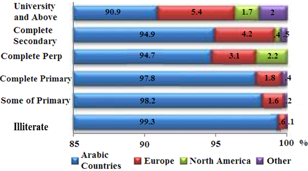 Figure 7 shows that the percentage of migrants moving to Arab countries decreases with increased educational level. Therefore, more than 98% of migrants who have completed primary education reside in Arab countries, compared to 95% who have completed secondary education and 91% who have a university education. It is also clear that migration to Europe and North America tends to increase with age and higher levels of education, as 1.6% of those with a primary education reside in Europe and North America, while 1.8% has completed secondary education and more than 5% have a university education.