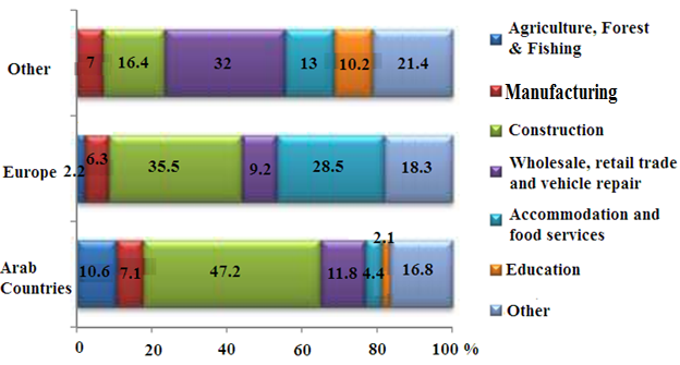 Figure 9 indicates that 47% of Egyptian migrants who move to Arab countries work in building and construction, 12% in wholesale and retail, 11% in agriculture, and 7% in manufacturing. 36% of Egyptian migrants who move to Europe work in the construction and building sectors, 29% in food and accommodation services, 12% in other sectors, and 9% in the wholesale and retail trade.