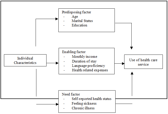 This study is guided by Andersen’s behavioral model of health service utilization (Andersen, 1995), which consists of predisposing, enabling, and need factors (see Figure 1). It was developed in the 1960s by Ronald Andersen to explain why people and family use health services. Andersen’s behavioral model consisted of factors such as individual demographic characteristics, attitudes, social structure, and health beliefs that predispose service use. This model is one of the most influential and reliable frameworks to assess health status and health service utilization patterns in diverse socio-cultural settings, as it draws upon a sociological perspective (Kasper, 2000).s