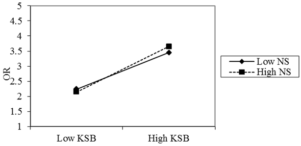 Figure 2. The interaction effect of need for status (NS) between knowledge sharing and organizational recognition.