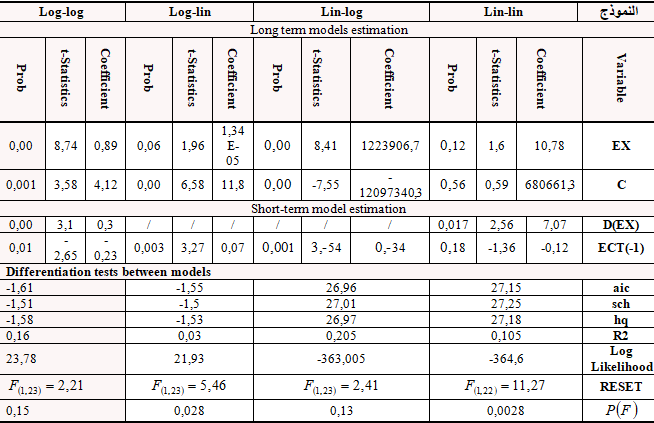 According to Table 4, it is clear that the model Log-log represents the best model. The ARDL model requires us to add time lagging variables into the model as explanatory variables so that we get the best ARDL model (1.1) in terms of the number of delays based on a Schwarz standard.