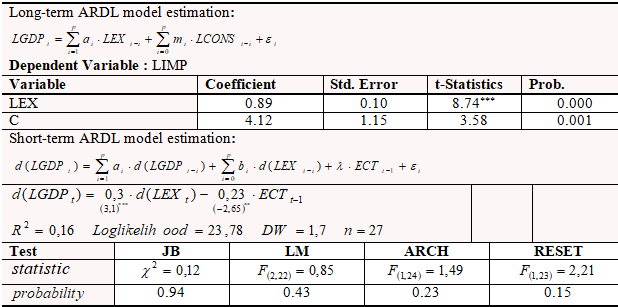 A statistically positive and significant impact on the long-term level of education expenditure on GDP, with the estimated long-term flexibility value of 0.89, means that a rise in education expenditure of 1% would lead to an increase in economic growth of 0.89%.