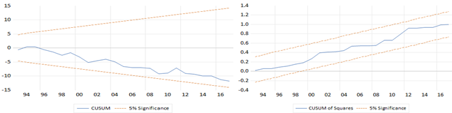 Given the long- and short-term equations of the previous ARDL model, the error correction parameter limit is within 5% of the expected negative signal. This result is considered to support a relationship between the two variables, and it also reflects the speed at which the model is adapted to move from short-term to long-term equilibrium, where the error-correction limit coefficient is (-0.23). Moreover, GPD is adjusted towards its equilibrium value each time by a proportion of the remaining imbalance from the period (t-1) equivalent to 23%.