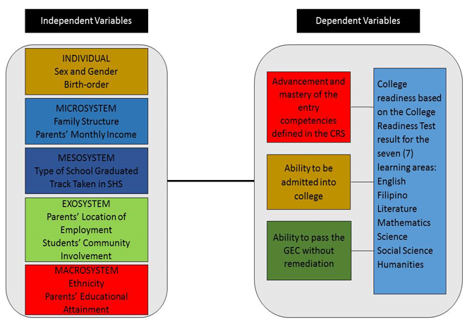 The variables included in different systems of the Human Ecological Systems Model constitute the independent variables of the study. The model starts with the individual system comprising of the physical and physiological organism, which interacts with and is integrated into other systems, such as sex, gender and birth order. The microsystem is where the primary socialization takes place and includes the family structure and parents’ monthly income, which provide an insight into the family environment. Meanwhile, the mesosystem consists of interactions between the microsystems, such as family and school interactions. This includes the type of SHS graduated and SHS track. The exosystem is the link between social environments not involving the children but may influence their experiences. Such examples include students’ community involvement and parents’ location of employment. Lastly, the macrosystem is the overarching cultural environment that influences the development of children. This constitutes their ethnicity and parents’ educational attainment. All of these systems interact and are linked with one another influencing the development of learners, dictating their level of college-readiness.