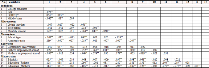 Table 3. Intercorrelations of human ecological systems variables and college readiness.