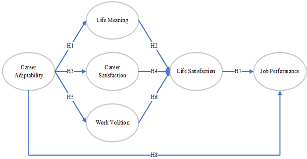 This research makes a theoretical contribution to the framework of an individual’s career development process by adding life meaning, career satisfaction, work volition, and life satisfaction as new variables to clarify the mechanism of impact between career adaptability and job performance. Extended on the base of CCT (Zhu et al., 2019), better performance is reached when individuals demonstrate continuous adaptation to work their environment, and therefore remain efficient under high pressure of extensive challenges and new demands. Since employees’ ability to adapt to different shifts was mostly tested regarding the relationships with other work-related outcomes in previous research (Buyukgoze-Kavas et al., 2015), the level of impact of career adaptability on internal motives and employees’ general well-being has not yet been fully discovered. This study shows how one’s ability to adapt in his/her career can activate internal well-being and how these internal motives can ultimately affect job performance. The findings of how life satisfaction is developed indirectly through career adaptability and the positive effect of life satisfaction on job performance have broadened the scope of career adaptability and promoted further research on its correlation with other well-being indicators.