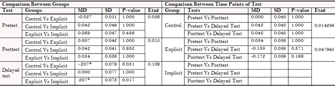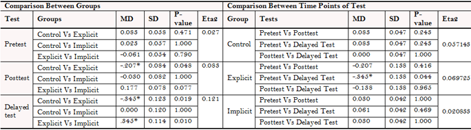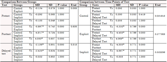 In order to answer the research question, it was important to ensure that there was no significant difference between the three groups across the main eight apology-specific strategies in the pretest. Hence, a one-way ANOVA was run for the pretests and the results confirmed that there were no significant differences among the three groups in the pretest across the eight strategies (i.e., F = 0.074 and P = 0.929 for an expression of apology; F = 0.773 and P = 0.465 for an explanation or account of the situation; F = 0.315 and P = 0.731 for an acknowledgement of responsibility; F = 1.930 and P = 0.152 for an offer of repair; F = 0.823 and P = 0.443 for a promise of forbearance; F = 1.103 and P = 0.337 for no response or apology; F = 1.138 and P = 0.325 for a denial for the need to apologize; F = 1.218 and P = 0.301 for a denial of responsibility). These results allow us to safely assume that the differences in the posttest and the delayed posttest reflect the effect of the treatment.