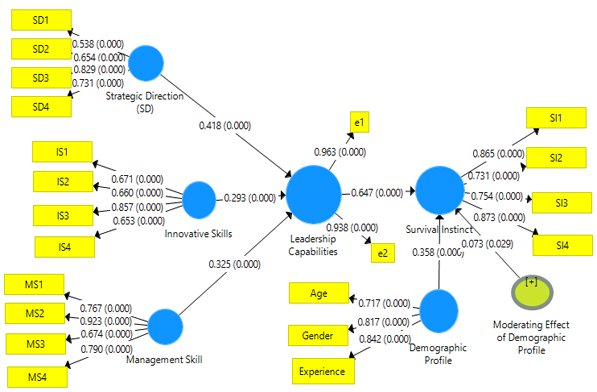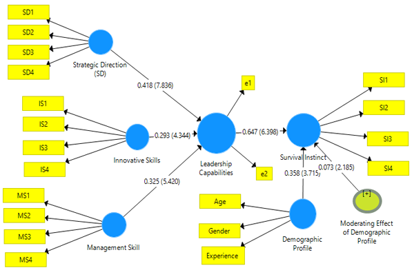 Four hypotheses were formulated for this study and the constructs were carefully selected. The first hypothesis focuses on the influence of strategic direction on the survival instincts of faith-based organizations. The leadership capabilities and survival instinct were measured with four items, as depicted in Table 1. The second hypothesis concentrates on the effect of innovative skills on the survival instincts of faith-based organizations. Innovative skills was measured with four items. The third hypothesis tested the influence of management skills on the survival instincts of faith-based organizations, and each construct was measured with four items. The fourth hypothesis looked at the moderating role of the demographic profile of the respondents on the relationship between leadership capabilities and survival instincts of the faith-based organizations. R-squared, t-statistic values, and p-values are critical indicators in SmartPLS that are used for the determination and interpretation of the results, as portrayed in Figures 1 – 3.