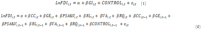 To examine the relationship between inward foreign direct investment and governance indicators (including control variables), the baseline model shown below in Equation 1 was used. Equation 1 was then expanded to create Equation 2, which was used as the governance index based on six different components of governance. Furthermore, to address endogeneity, a lag value was taken for one year in Equation 2.