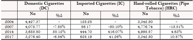 This is presented in Table 1, which shows the change in the number of domestic cigarette consumers in 2017, which is the opposite to imported and hand-rolled cigarette consumers. It is possible that the consumers of domestic cigarettes changed their behavior to consume imported or hand-rolled cigarettes, and this demonstrates the linkage between tobacco products.