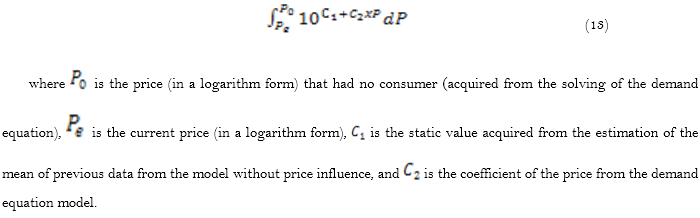 After estimating the relationship using the above models, the models were then used to estimate the consumer surplus using the integration technique from the price where there were no consumers (demand was zero) to the current price. Since the data used had a logarithm base of 10, the estimation of the consumer surplus was estimated using Equation 13.