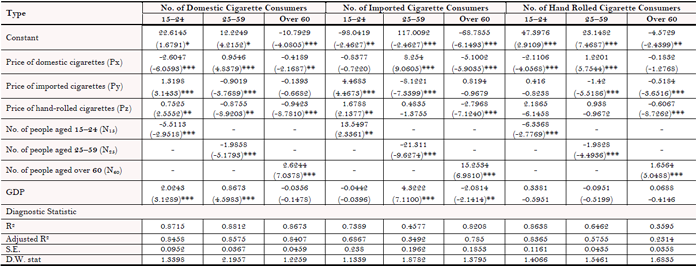 In regard to the influence of GDP on the increasing number of consumers of domestic cigarettes, the relationship with consumers aged 15–24 and 25–59 was in the same direction, i.e., domestic cigarettes were considered as normal goods. When considering the population of the age ranges, it had a negative relationship with consumers aged 15–24 and 25–59 but had a positive relationship with consumers aged over 60.