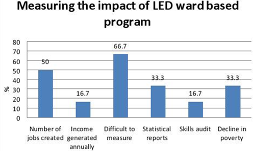 The lack of budget as per results may connote that municipalities allocate any budget to the program with less considerations. Patterson (2008) claims that municipalities have not yet well included LED function as a priority and this is noted through the limited funds that are allocated to LED initiatives. Most municipalities have developed a set of policies but those policies are not aligned to LED budget.