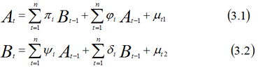 The model assumed that the disturbances μt1and μt2are uncorrelated. The two equations developed by Granger is a case of bilateral causality with four possible outcomes. It can be unidirectional causality from B to A or from A to B. This is possible when the estimated coefficient of the lagged B is significant while that of lagged A is not significant for the former, while the reverse is the case when causality runs from A to B. Feedback or bilateral causality from A to B and from B to A at the same time. This is a case where both coefficients of lagged B and A in equations (3.1) and (3.2) are both significant. It can be a case of independence where there is no causation whatsoever, that is, the set of A and B coefficients are not statistically significant.
