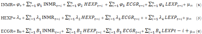 where ECGR: economic growth (proxied by real gross domestic product). HEXP: per capita public health expenditure, INMR: infant mortality rate (proxied by under-five mortality) level, LEXP: Life expectancy.