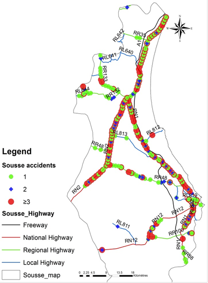 There were two sets of data used: accidents data and highways data. Accidents data were obtained from the NOITDSRS in Tunisia. Highways data were obtained from MEHTD in Tunisia. The different highways considered here are Local Highways (LH), National Highways (NH), Regional Highways (RH) and Motorway (A1). The Municipal Highways and railways that are shown in grey colors in Figure 1.a are excluded from our analysis. Knowing the geographical location of accidents permits to determine their causal factors. In the region of Sousse, accidents are uniformly and spatially distributed see Figure 1.b.