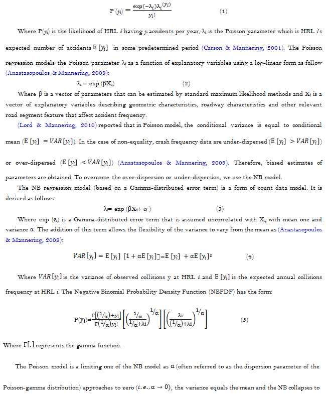 Many previous researches have used count data models for predicting road traffic accidents. Among these models, there is the Poisson model, which is extensively employed in the literature based on the study of Lord (2006) and successors that consider the NB and zero-inflated models (Anastasopoulos & Mannering, 2009). For the basic Poisson model known as a Log-Linear model, the Poisson distribution gives the likelihood of an event count yi, given the vector of covariates Xi, as follows: