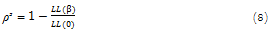 Where LL (β) is Log-likelihood for all the vector coefficients β, and LL (0) is the Log-likelihood for β equal to zero. The ratio ρ2 takes the values from 0 to 1. When the value of ρ2 is near 1, the model fits well. In general, when ρ2 is superior 0.1, the goodness fit of the model is accepted (Ulfarsson, Kim, & Booth, 2010).