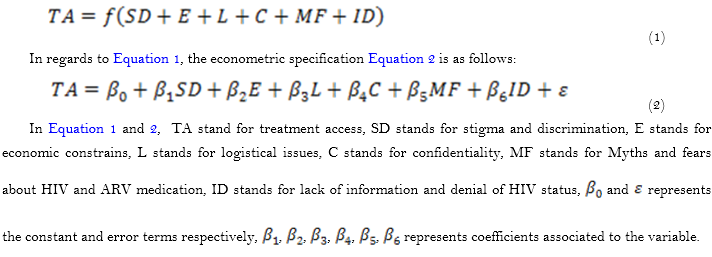 The model specification for treatment access is the concise description of how the variables relate to each other. The independent variables for treatment access include stigma and discrimination, economic contrain, logistical, confidentiality, Myths and fears about HIV and ARV medication, Lack of information about HIV and denial of HIV test results.