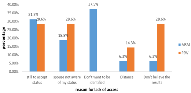 Just over half (56.0%) of MSMs and two third (65%) of FSW believe they had access to HIV treatment services just like anyone in the general population as seen in Figure 1. The major reasons advanced for lack of access to HIV treatment services for MSM were; [don’t want to be identified (37.5%) and non - acceptance of status (31.3%)], while for FSW, their major reasons were; [still to accept status(28.6% ), don’t want their partners to know their status (28.6% ) and that they don’t believe their results ( 28.6%)] as revealed by Figure 2.