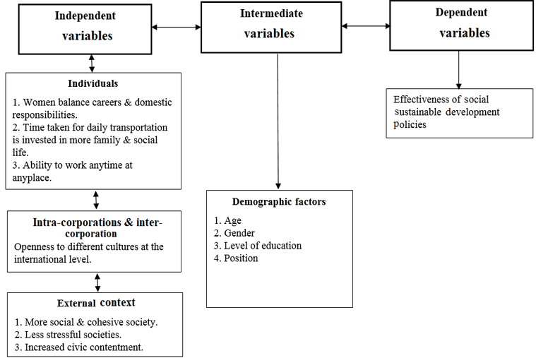 This paper has examined the relationship between the virtual workplace and the effectiveness of social sustainable development policy by studying the independent variables at three different levels: individuals, intra-corporation & inter-corporation/organizational, and the external context. The dependent variable was studied by examining the effectiveness of social sustainable development policies. The investigation concluded that the three levels of independent variables related to the virtual workplace had a significant relationship with the dependent variable of the effectiveness of social sustainable development policy.
