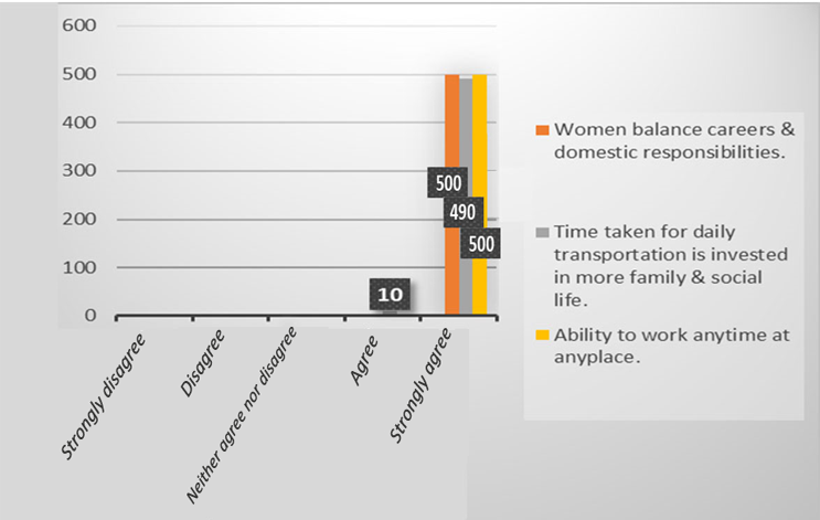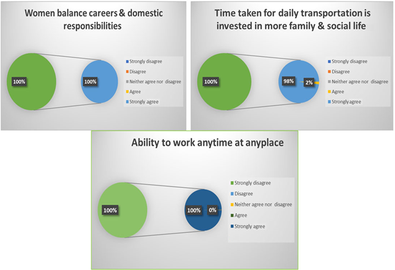 Figure 3 confirms that for the two independent variables of “Women balance careers & domestic responsibilities” and “Ability to work anytime and anywhere,” 100% of employees selected “strongly agree,” while for the variable “Time taken for daily transportation is invested in more family & social life,” 98% of employees selected “strongly agree,” and 2% selected “agree.”