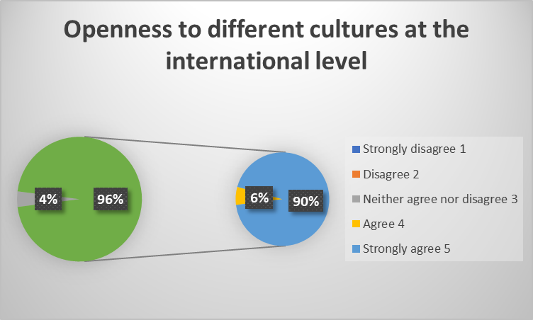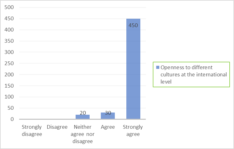 Figure 5 confirms that for the independent variable “Openness to different cultures at the international level,” 90% of employees selected “strongly agree,” 6% of employees selected “agree,” and 4% of employees selected “neither agree nor disagree.” We may conclude that for the independent variable “Openness to different cultures at the international level,” a very high percentage (90%) of employees selected “strongly agree,” which represents 450 employees out of 500.