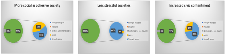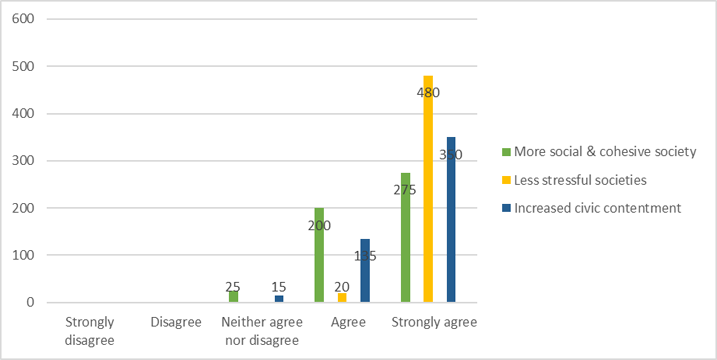 Figure 7 demonstrates that the variable “Less stressful society” had the highest level of agreement as 96% of employees selected “strongly agree,” and 4% of employees selected “agree.” For the variable “Increased civic contentment,” 70% of employees selected “strongly agree,” and 27% of employees selected “agree,” while 3% of employees selected “neither agree nor disagree.” Finally, for the variable “More social & cohesive society,” 55% of employees selected “strongly agree,” 40% of employees selected “agree,” and 5% of employees selected “neither agree nor disagree.” We may conclude that the independent variable “Less stressful society” had the highest percentage as 96% of employees selected “strongly agree,” representing 480 employees out of 500.