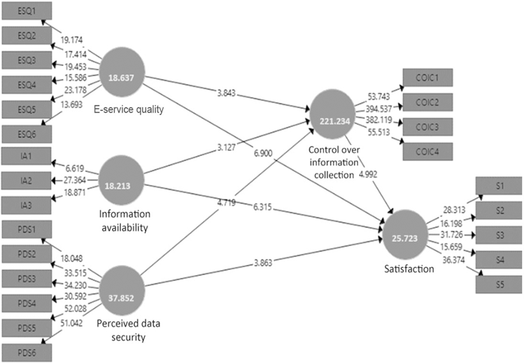 The effect of perceived privacy on e-service quality was significant with a T-stat of 4.526 > 1.96 and a p-value of 0.000 < 0.50. Also, the effect of perceived privacy on citizen satisfaction was significant with a T-stat of 4.083 > 1.96 and a p-value of 0.000 < 0.50. Thus, H5, stating that perceived privacy affects e-service quality, and H6, stating that perceived privacy affects citizen satisfaction, are accepted. The results of this study align with the empirical evidence obtained by Jin and Park (2006) and Ahmad and Al-Zu’bi (2011). This means that the better the perception of online user privacy, the higher the satisfaction that the user will experience.