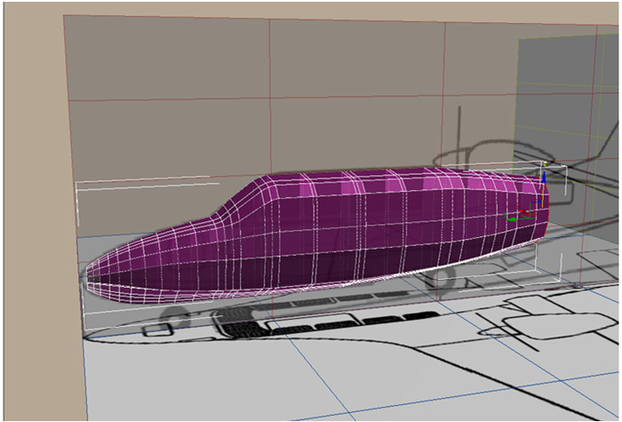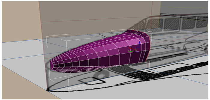 At the next stage we will replicate the contours of the aircraft body (see Fig. 6) applying he method of sequential extrusion to the group of polygons and subsequent projections alignment, While increasing the number of polygons moving along the body axis, must be collate the extrusion process with aircraft projections in all three planes.