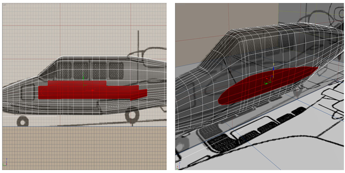 Before selecting a number of polygons in the tail unit, it is required to review the aircraft projection from above (see Fig. 8, on the left). These polygons will be used as initial ones to make the vertical tail plane of future aircraft. The vertical plane consists of two main components, the leading and trailing edge and it is a rudder at the same time. The tail unit is simulated with use of polygonal extrusion method according to aircraft projections (Fig. 8). Cut the horizontal stabilizer mounting socket contour in the certain point of the tail unit plane with Cut tool (see Fig. 9). Then can be started sequential polygon extrusion, the result is shown in Fig. 9.