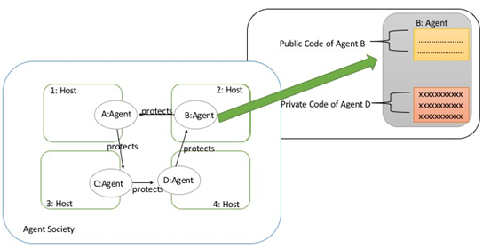 Once we have a protected mobile agent-based system, many possible applications can be found to use our solution. We posed the possibility to apply this idea to a completely dynamic environment as mobile agents. These systems tend to be compounded of several agents that migrates to non- trusted host with the final target to complete collaborative tasks. A deep study has demonstrated the high difficulty found to guarantee agent and its execution integrity since agencies (hosts) are mostly unacknowledged. Along this section we describe how to address the protection of the agents versus potentially malicious agencies. Figure II shows agent’s inter- action with other remote agents and in turn these are running in different hosts. We propose a solution for known malicious hosts problem by means of a mutual protection between every agent involved in the system.