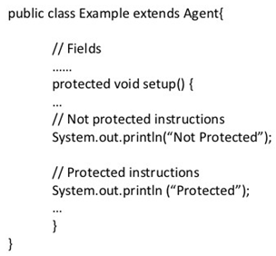 The class that illustrates the figure ExampleCode shows non protected agent source code, which inherits from Agent class and its execution code is inside the setup() method.