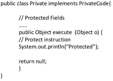 Protected system generation phase takes as input the in- formation collected from both previous stages to build the protected system. Several considerations are taken to guarantee system integrity. Two new classes are generated at least, one of them is related to new secure agent with its public code (data and instructions) and the other with the private code, as we pointed out. Additionally, to these classes, as many internal classes contain the original agent, then is required the creation of some new classes. These are precompiled classes that are generated taking advantage of BCEL dynamic component. This part of the BCEL API facilitates tasks related to the creation class files skeleton and, depending on the security parameters settings in the previous phase, the original code is distributed among different parts. Figure 9 depicts the content of an example with the public part of a new protected agent based in the example in figure 10. We notice that the class code has been modified as we below described: