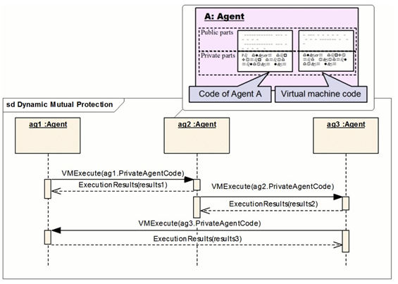 The Dynamic Protection Strategy process is illustrated in figure 11. We illustrated how in the first exchange ag1 plays the role of protected agent, while ag2 plays protecting agent role (secure coprocessor). While the exchange is actually taking place, ag1 sends a private code section to the virtual machine of ag2. This virtual machine processes the private section and returns some results (results1). Subsequent exchanges illustrate ag3 acting as protecting agent for ag2 (in this case the protected agent), and finally ag1 protecting ag3. We claim the attention of the scalability of this scheme since only a few agents (one in most cases) are involved in the protection of any other agent and can be applied to cases with disregard of the number of agents involved.