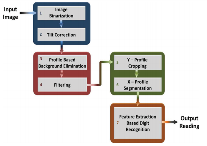 Kulkarni and Kute [12] discusses an algorithm for the recognition of seven segment numbers on display so that the algorithm can be utilized for applications such as the automated reading of LCD-based meters. The algorithm outlines a 7-step process consisting of four types of operations such as object detection, noise removal, image segmentation and numeral recognition based on pixel density feature extraction. Figure 4 shows the steps involved in the algorithm developed by