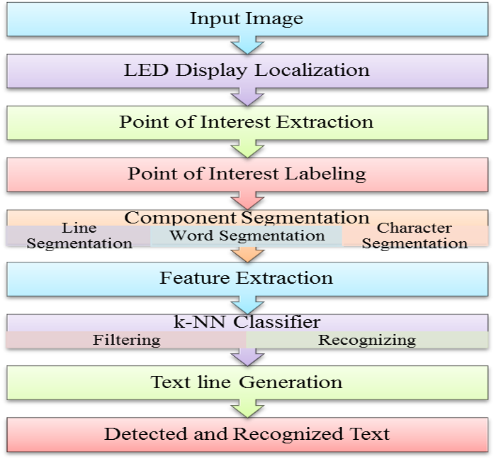 Vandana and Kaur [14] proposed a method to solve the problem of LED text detection and recognition. They extract the board region from natural image to perform their method. The work is developed by firstly inputting an image. The input image is then processed to convert the colors to grayscale. Then, the image is segmented to extract the rectangular region. The single character detected with single character extraction method. They recognized the characters with 88.57% accuracy.