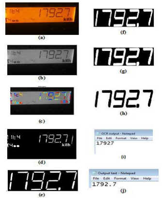 Fig-6. OCR Results (a) Original image sent by the consumer (b) Gray scale image (c) MSER regions (d) Binary mask (e) Cropped kWh image (f) & (g) Horizontal & Vertically dilated image (h) Complemented image (i) OCR function output (j) Final output