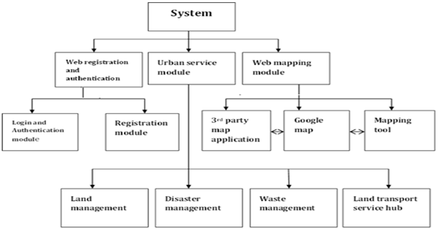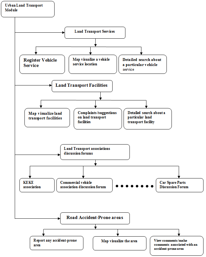 The urban land transport management module: The urban land transport management module serves as a land transport hub where all the services and facilities that are associated with the land transport are made available and accessible to all the system stakeholders through the use of mapping tools. The functional breakdown for this module is presented in Figure 6. The services in the urban land transport management module include filling stations, car spare parts shops, car hiring centers, mechanic shops, etc. and facilities include parks, roundabouts, flyovers, traffic lights, drivable roads.