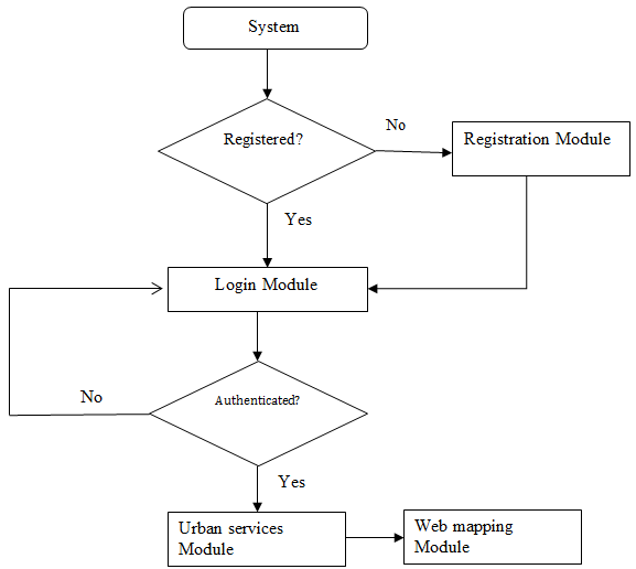 Then, the detailed flowcharts and flow diagrams of the various submodules are developed. The flow diagram for the registration and authentication module is shown in Figure 3.