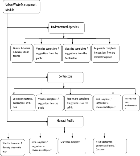 The urban waste management module: The urban waste management module enables waste bins and dumping sites to be mapped, monitored and managed. The stakeholders for this module include the public, environmental agencies and contractors who are hired for waste disposal and management. This module enables the public to report about poor waste management in their localities as well as insufficient refuse bins. On the other hand, environmental agencies can use to map visualize dumping sites and dumpsters for different locations thereby keeping track of how well the contractors are doing their jobs.